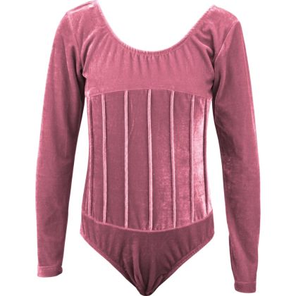 Детско трико MAXIMA от кадифе с дълъг ръкав и декоративни шевове. Трикото има подплата на предната част, закопчаване е тип боди с метални, телени копчета. Подходящо за художествена гимнастика, танци и балет. Материал - полиестер, ликра, памук.