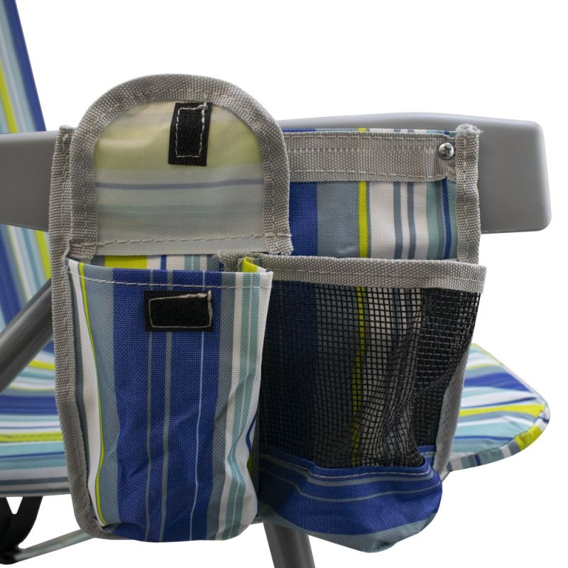 Наслади се на слънчевите дни с този удобен, лек и здрав сгъваем плажен стол, идеален за къмпинг, плаж, пикник или градина. Проектиран с мисъл за мобилност и комфорт, този стол комбинира модерен дизайн, качествени материали и ергономичност, които го правят незаменим аксесоар за всяко лятно приключение. Разполага с възглавница, поставка за чаша / бутилка, малък джоб с велкро лепенка, голям джоб с цип на гърба и хладилен джоб с цип отново на гърба. Възможност за промяна наклона на облегалката в 5 различни положения. Изработен от здрава стоманена рамка с диаметър 23 мм и издръжлив на различни атмосферни влияния полиестерен плат Oxford 600D, които предоставят стабилност и комфорт. Столът се сгъва и разгъва лесно и бързо. Разполага с дръжка и с презрамки, които дават възможност да бъде носен като раница. Максимална височина облегалка в положение стол – 77 см. Минимална височина облегалка в положение шезлонг – 27 см. Размери седалка – 46х50 см. Височина седалка – 24 см. Дължина подлакътник – 44 см. Ширина стол с подлакътниците – 59 см. Заемана подова площ – 57х54 см. Размери възглавница – 23х12х6 см. Тегло – 3.6 кг. Размери сгънат - 74х63х11 см. Материал – стомана, полиестерен плат Oxford 600D. Максимално натоварване - 110 кг.