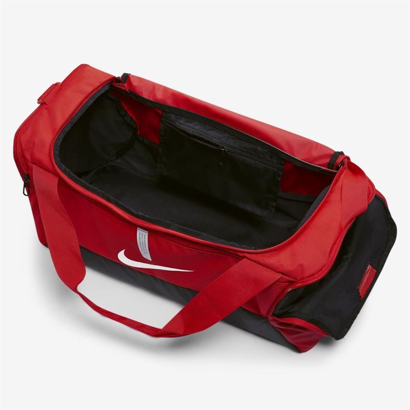 Спортен сак NIKE academy team, Червен, 41 л с твърдо дъно от здрава и плътна текстилна материя. Подходящ е както за тренировка, така и за пътуване. С регулируема презрамката за рамо и две къси дръжки, което го прави подходящ за носене в ръка. Сакът е със здрава основа с покритие, което предпазва от влага. Разполага с: Едно основно отделение; Странично отделение с цип за мокро/сухо или обувки. Малък вътрешен джоб с цип; Преден джоб с цип; Страничен джоб с мрежа; Размери - 53х25хH28 см. Обем - 41 л. Минимална дължина на презрамката - 65 см. Максимална дължина на презрамката - 132 см. Материал – полиестер. Тегло - 500 г. Цвят – Червен.