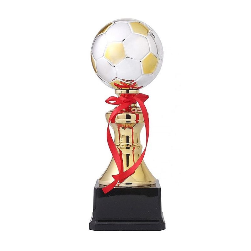 Купа MAXIMA с футболна топка, върху черна основа, с червена панделка. Трофейната купа е изработена от метал (част от свързващите елементи) и пластмаса (топката, основата и друга част от свързващите елементи). Подходяща за награждаване във футболни турнири и първенства. На основата може да се постави плочка с текст или лого. Обща височина - 31 см. Диаметър на топката - 10.5 см. Размери на основата - 11х11 см. Максимален размер на плочката - 8.9х4.4 см. Тегло нето - 490 г. Тегло бруто - 520 г. Размери кутия - 33х14х14 см. Материал - метал, PVC. Цвят на купата - златист, сребрист. Цвят на основата - черен.