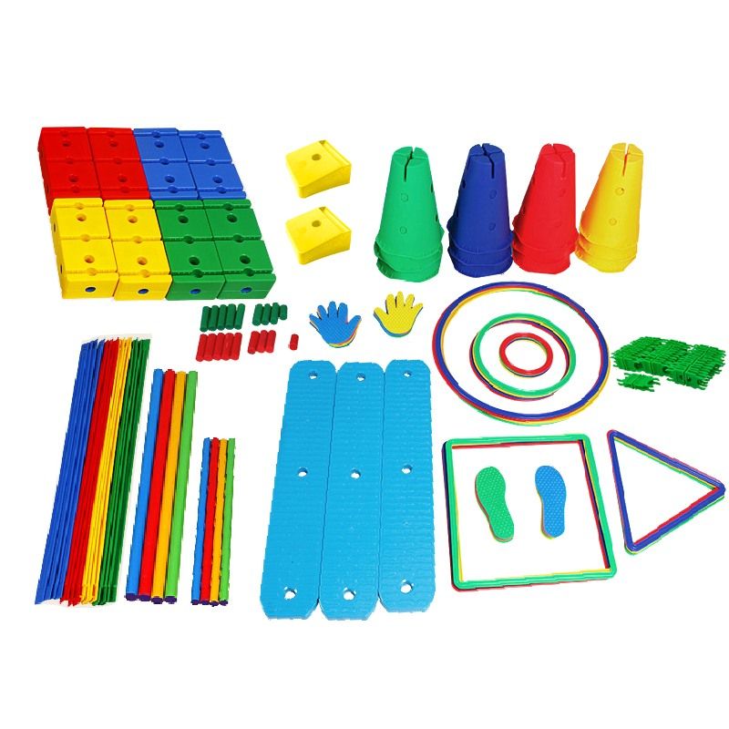 Игрален комплект конструктор 121 елемента. Комплектът съдържа: 1. Отпечатъци на стъпки - 3 чифта с дължина 22 см. 2. Отпечатъци на длани - 3 чифта с дължина 19 см. 3. Тояжки обли - 4 броя с дължина 71 см и диаметър 28 мм. 4. Тояжки обли - 8 броя с дължина 35.5 см и диаметър 28 мм. 5. Тояжки обли - 18 броя с дължина 7 см и диаметър 28 мм. 6. Плоски тояжки - 16 броя с дължина 97.5 см и ширина 3 см. 7. Двойни блокчета – 8 броя с размер 30х15х10 см и отвори за тояжки от 6 страни. 8. Дъски за равновесие – 3 броя с размер 80х15х2.5 см с по 3 отвора за тояжки. 9. Капаци – 2 броя с размери 16х15х5.5 см с по един отвор за тояжки. 10. Конуси с отвори за тояжки и прорези за плоски обръчи - 12 броя с височина 31 см. 11. Плоски кръгли обръчи – 18 броя, от които 4 с диаметър 67 см, 4 с диаметър 39 см и 10 с диаметър 17 см. 12. Плоски квадратни обръчи – 4 броя с размери 43х43 см. 13. Плоски триъгълни обръчи – 4 броя с размери 37х37х37 см. 14. Свързващи елементи за тояжки и / или плоски рингове с възможност за завъртане на 360 градуса – 12 броя. Комплектът дава възможност за изграждане на обемни фигури, което развива въображението, сръчността и координацията на децата. Подходящ за употреба в детски градини и училища. Материал – PVC. Тегло нето – 20.4 кг. Тегло бруто – 21.4 кг. Размери кашон - 97х69х27 см.
