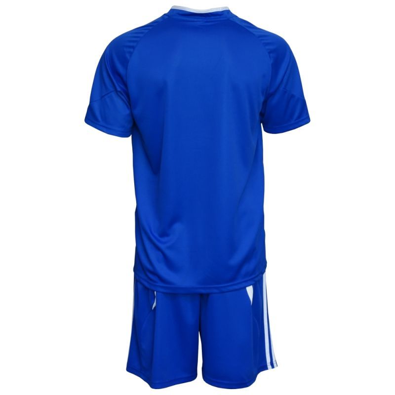 Екип за футбол/ волейбол/ хандбал фланелка с шорти син с бяло. Подходящ за тренировки и официални мачове. Екип без номер. Мека и здрава материя. Материал: бързосъхнещ полиестер (Quick dry технология, осигуряваща бързо отвеждане на потта от кожата и изпаряването и. Създава усещане за комфорт на кожата при интензивни натоварвания).