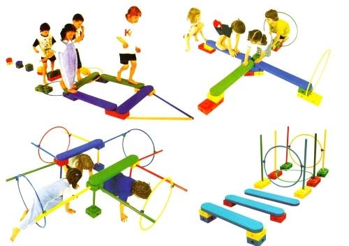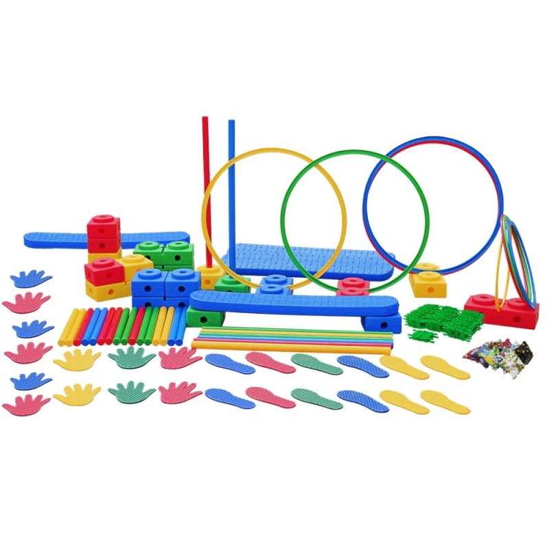 Игрален комплект конструктор 114 елемента. Комплектът съдържа: 1. Отпечатъци на стъпки - 6 чифта с дължина 22 см. 2. Отпечатъци на длани - 6 чифта с дължина 19 см. 3. Тояжки - 16 броя с дължина 36 см и диаметър 28 мм. 4. Тояжки - 8 броя с дължина 71 см и диаметър 28 мм. 5. Единични блокчета – 12 броя с размер 13х13х8.5 см и отвори за тояжки от 5 страни. 6. Двойни блокчета – 8 броя с размер 27х13х8.5 см и отвори за тояжки от 5 страни. 7. Дъски за равновесие – 4 броя с размер 81х13х4 см, с 4 единични и един троен отвор за блокчета. 8. Плоски обръчи – 8 броя, от които 4 с диаметър 39 см и 4 с диаметър 67 см. 9. Торбички за хвърляне в цел – 10 броя, пълни с пясък, с размер 9х9х3 см. 10. Свързващи елементи за тояжки и / или плоски рингове с възможност за завъртане на 360 градуса – 24 броя. Комплектът дава възможност за изграждане на обемни фигури, което развива въображението, сръчността и координацията на децата. Подходящ за употреба в детски градини и училища. Материал - PVC. Тегло нето за комплект - 17.9 кг. Тегло бруто за комплект - 18.9 кг. Размери кашон - 83х71х20 см.