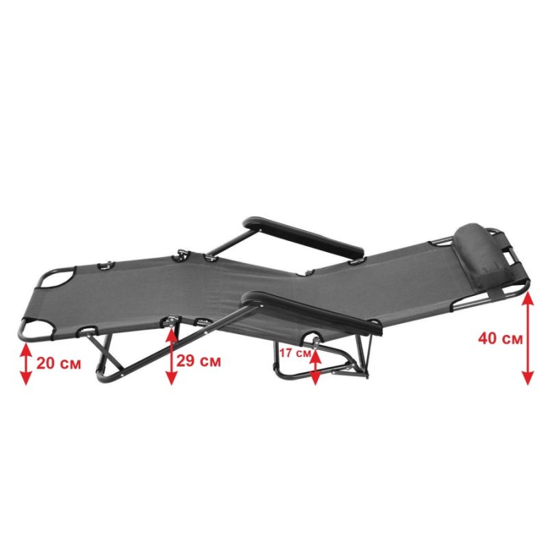 Сгъваем стол шезлонг - разгъва се до походно легло с дължина 153 см, с възглавничка за главата. Здрав и устойчив на различни атмосферни условия, поради факта, че е изработен от стомана и textilene - мрежест, дишащ, здрав, бързосъхнещ материал, което прави стола подходящ за градина, тераса, плаж, къмпинг. Многофункцинален, лек и компактен. Лесно сгъване, разгъване и преминаване от една функция в друга. Дължина - 153 см. Ширина за сядане - 47 см. Ширина с подлакътниците - 60 см. Дължина подлакътник - 49 см. Размери сгънат - 89х60х12 см. Дебелина тръба - Ф20 мм и Ф25 мм. Размери възглавница - 33х12х6 см. Тегло - 4.5 кг. Максимално натоварване - 90 кг. Материал - стоманена рамка, textilene. Височината на седалката в положение стол е 30 см в задния край и 45 см в предния. Височината на седалката в положение шезлонг е 17 см в задния край и 27 см в предния. Височината в положение легло в трите секции е съответно 21 см, 23 см и 29 см.