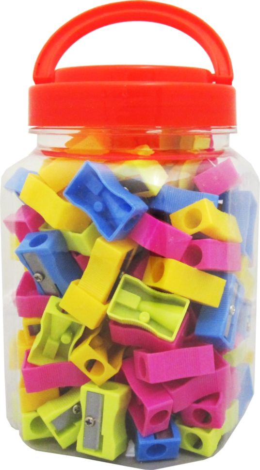 Острилка TIP TOP малка. Подходяща за поставяне в несесер. Удобна, компактна и практична. Микс цветове в буркан. 120 броя в опаковка. Размери опаковка 15см*ф9см. Материал - ПВЦ, метал. Тегло за буркан - 300г.