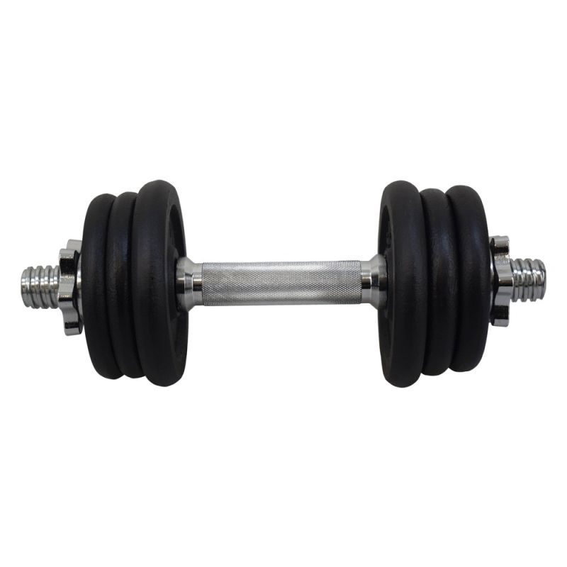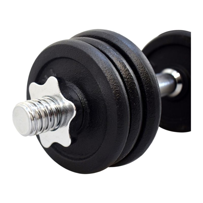 Дъмбел 10 кг MAXIMA, Железен. Подходящ за домашна употреба. Лесен за поддръжка. Позволява изпълнение на богат набор от упражнения, натоварващи различни групи мускули. Включва дръжка с две гайки. Четири диска от 1 кг и два диска от 1.5 кг. Отвор дискове - 30 мм. Гайка – ф30. Дебелина дръжка (лост) - 28 мм. Дължина дръжка (лост) – 36 см. Тегло - 10 кг. Дължина отсег за хващане дръжка за дъмбел – 12 см. Дебелина отсег за хващане дръжка за дъмбел - 30 мм. Тегло – 10 кг.